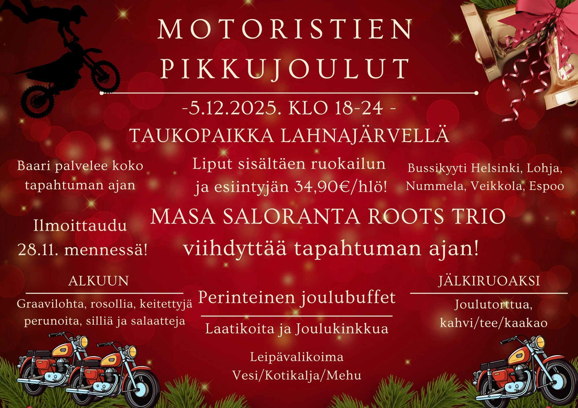 Motoristien pikkujoulut Lahnajärvellä 5.12. klo 18-24, ilmoittaudu mukaan!