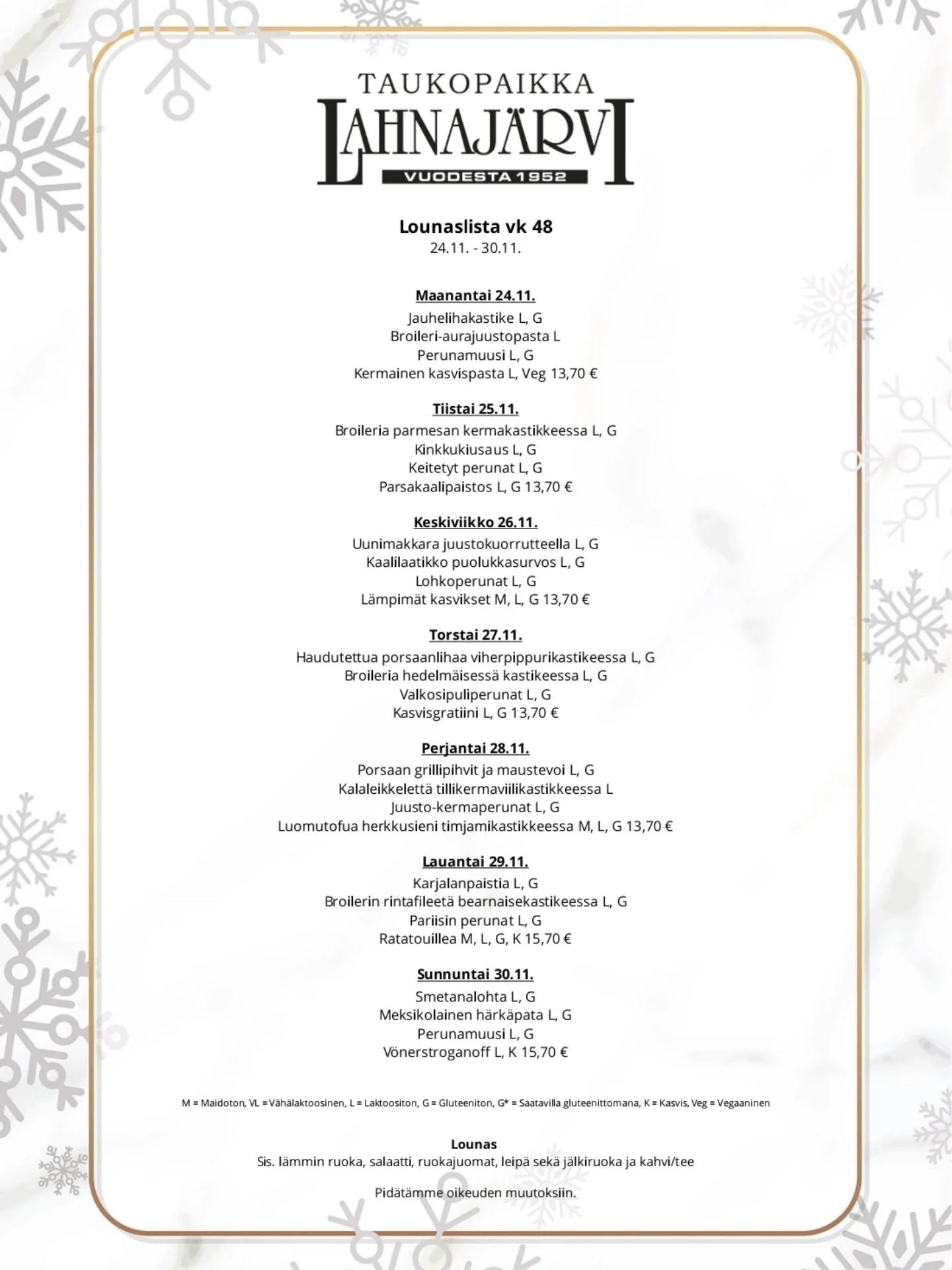 Lahnajärvi on perinteitä, luontoa, hyvää, lähellä tuotettua ruokaa ja sydämellistä asiakaspalvelua. Se on taukopaikka autoilijoille, olohuone lähiseudun asukkaille ja virkistyskeidas lomalaisille. Lahnajärvellä järjestät kokouksen tai juhlan, joka muistetaan. Lahnajärvi on myös uusi, pirteä vaihtoehto eteläisen Suomen ryhmämatkailijoille.